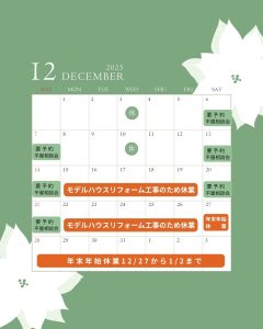 NOTICEイベント一覧 2025年12月01日 モデルハウス改装に伴う臨時休業のお知らせ 平素は格別のお引き立てを賜りありがとうございます。 弊社モデルハウス改装工事に伴い、下記日程で臨時休業させていただきます。 12月15日(月)~12月26日 ※ただし、12月20日(土)・21日(日)は通常営業いたします。 ご不便をおかけいたしますが、何卒ご理解とご協力のほどよろしくお願い申し上げます。 過去のイベント一覧へ